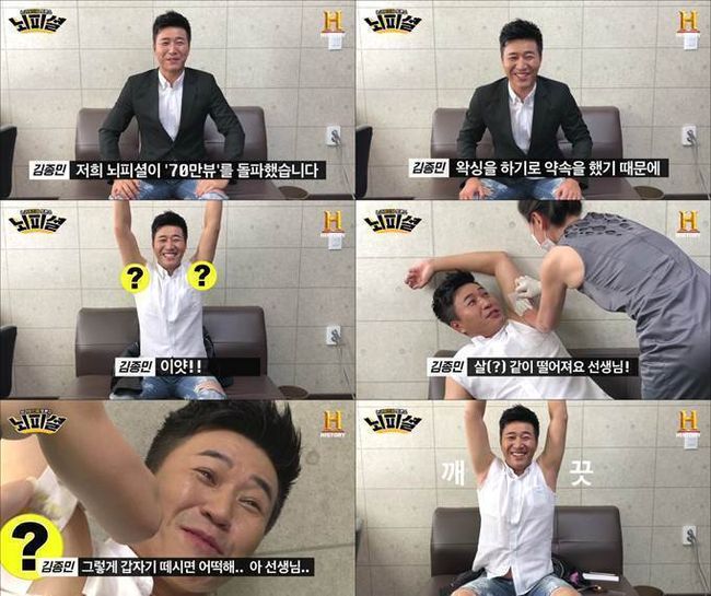 김종민이 히스토리 채널의 웹예능 ‘뇌피셜’의 목표 조회수인 30만뷰를 단 하루 만에 달성해 공약으로 내건 왁싱 역상을 깜짝 공개했다.