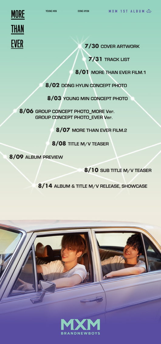 듀오 MXM이 자신들의 첫 번째 정규앨범 'MORE THAN EVER’의 공식 프로모션 스케줄을 공개하며 컴백에 대한 기대감을 고조시켰다.