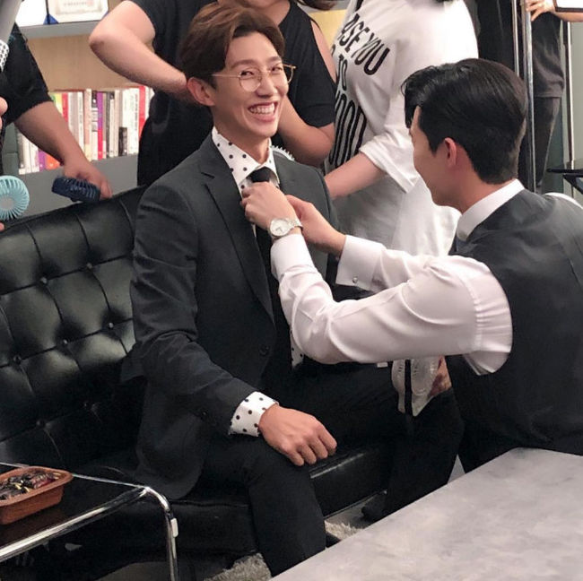 공개된 사진 속 박서준은 마치 스타일리스트처럼 강기영의 넥타이를 고쳐주고 있다. 이에 강기영은 환하게 웃고 있어 현장의 유쾌한 분위기를 읽을 수 있게 한다.