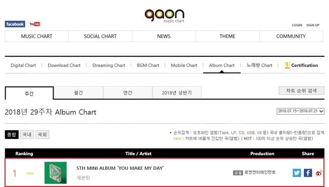 세븐틴은 지난 16일 발매한 미니 5집 ‘YOU MAKE MY DAY(유 메이크 마이 데이)’로 폭발적인 반응을 얻고 있는 가운데 가온차트 2018년 29주차(07.15~07.21 집계 기준) 앨범 차트에서 1위를 차지해 눈길을 사로잡았다.