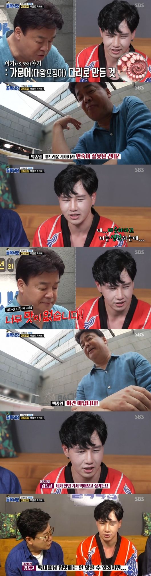 백종원은 조심스럽게 한 입 맛 보더니 "이건 다코야키가 아니다"며 안에 들어있는 것이 문어가 아닌 오징어라고 했다. 사장 역시 이를 인정했다. 백종원은 오징어인지 알수 없는 메뉴판을 지적했다. 이어 반죽자체에 아무 맛도 없다며 반죽부터 잘못됐다고 했다. 또한 구워지는 모습의 시각적인 효과 역시, 많이 버벅거린 솜씨가 어설퍼보였다고, 그 맛이 고스란히 나타났다고 했다. 급기야 "기다린 시간에 비해 너무 맛 없다, 내 인생에서 가장 맛없게 먹은 것"이라면서 반응이 싸늘했다.