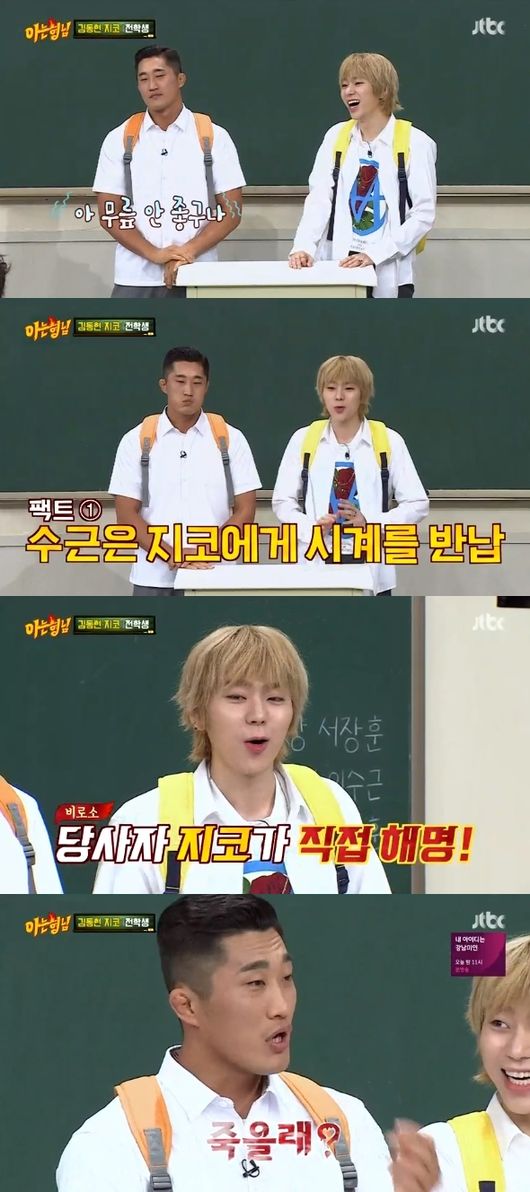 이날 지코는 "난 알고보면 음악밖에 모른다"고 말했고, 김동현은 "알고보면 순수한 꽃미남 파이터"라고 자신을 소개했다. 또 지코는 지난해 이수근과 시계를 두고 내기를 한 걸 기억하고, 두 개의 시계를 차고 등장해 모두를 폭소케 했다.