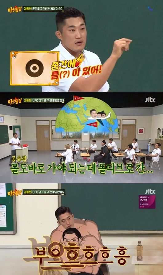 이어 그는 "나는 평생을 이기고 기절시키는 일을 했다"며 '아는형님' 내 최고 파이터 강호동을 손쉽게 이길 수 있다는 식으로 말해 파장을 일으켰다. 결국 김동현은 강호동과 맞붙어 밭다리에 넘어가지 않는 모습으로 모두를 놀라게 했다.