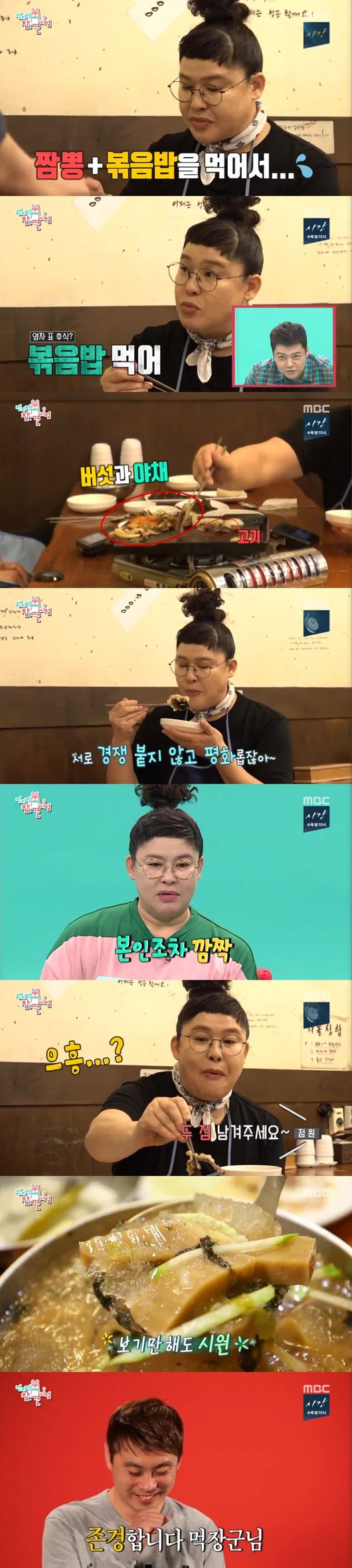 후식으로 묵사발에 볶음밥도 먹자고 제안, 동치미로 건배하면서, 볶음밥도 3인분이나 시켰다. 남으면 싸가겠다다고 했으나 역시 모두 클리어했다. 패널들은 "역시 상상 그 이상"이라며 엄지를 세웠다.