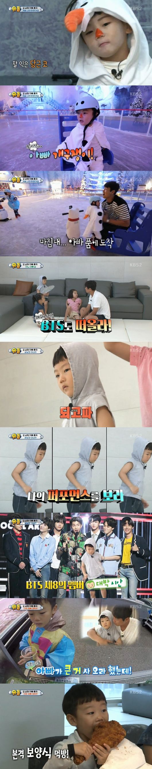 집에 돌아온 후 어느 비 오는 날, 비 오는 날 떠오르는 것이 무엇이냐는 질문에 시안이는 BTS를 말해 이동국을 어리둥절하게 만들었다. 방탄소년단의 ‘상남자’를 완벽 마스터한 시안이는 소파 위를 무대 삼아 카리스마 눈빛과 노래, 안무까지 정확하게 따라하며 귀여움을 발산했다.