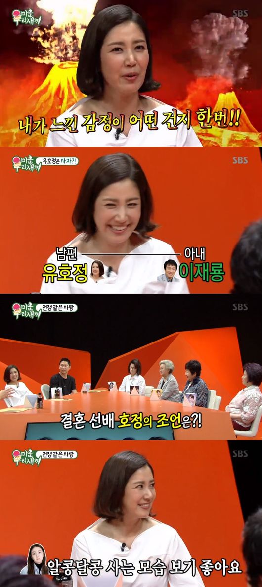 서장훈은 이재룡이 유호정에 대해 사자 같다고 말했다고 언급한 바. 신동엽은 "결혼을 하니까 아내가 사자로 바뀌더라. 아이를 낳으니까 거기에 날개가 생기더라"고 자신의 경험담을 털어놨다. 유호정은 "연약한 척해야 남편이 더 챙겨주는 것 같다. 전 맏이로 자라서 모든지 제가 해야 직성이 풀리는 타입이다. 말을 하기 전에 제가 해놨다"고 말했다.