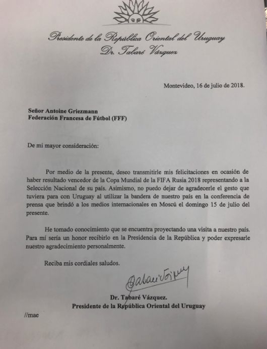 바스케스 회장은 그리즈만에게 보낸 공식서한에서 "당신을 초대하는 것은 영광이다. 프랑스 대표팀의 우승을 축하한다. 축구와 월드컵은 국가를 하나로 뭉치게 하는 스포츠이다. 이번 일을 계기로 우루과이와 프랑스의 유대 관계가 더욱 강화될 것으로 믿는다"고 강조했다.