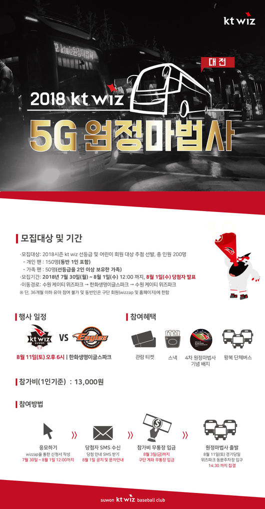 KT 위즈가 내달 11일 대전에서 열리는 한화와 경기에 열띤 응원을 펼칠 원정 마법사를 모집한다.