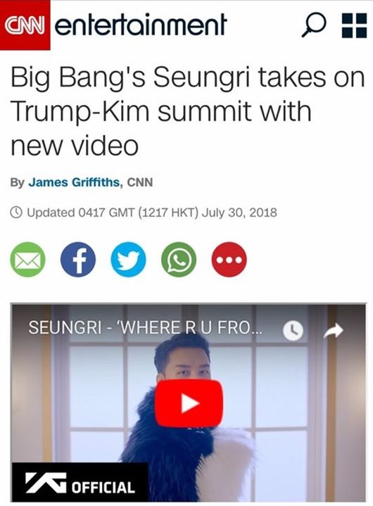 CNN은 30일(현지 시각) ‘Big Bang's Seungri takes on Trump-Kim summit with new video (새로운 뮤직비디오에서 북미 정상과 겨룬 빅뱅의 승리)’라는 제목으로 ‘WHERE R U FROM’의 뮤직비디오를 흥미로운 시각으로 분석했다.