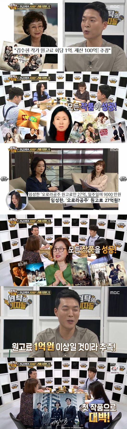 또한 "막장으로 유명한 임성한 작가는 편당 1800만원을 받은 것으로 알려졌다"고 밝혔으며, 김은숙 작가에 대해서는 "15년 동안 한 번도 실패한 적이 없고 당대 최고의 트렌디 드라마가 된 작가"라고 설명했다.
