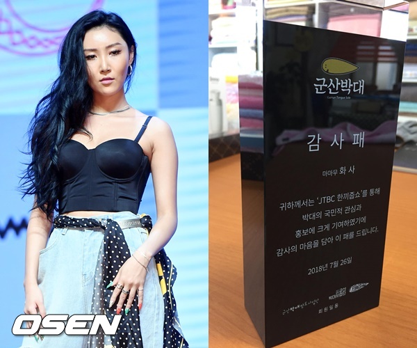 31일 군산박대향토사업단은 SNS에 감사패 사진을 게재했다. 감사패에는 화사의 이름과 함께 “귀하께서는 JTBC ‘한끼줍쇼’를 통해 박대의 국민적 관심과 홍보에 크게 기여하였기에 감사의 마음을 담아 이 패를 드립니다”는 글을 담았다.