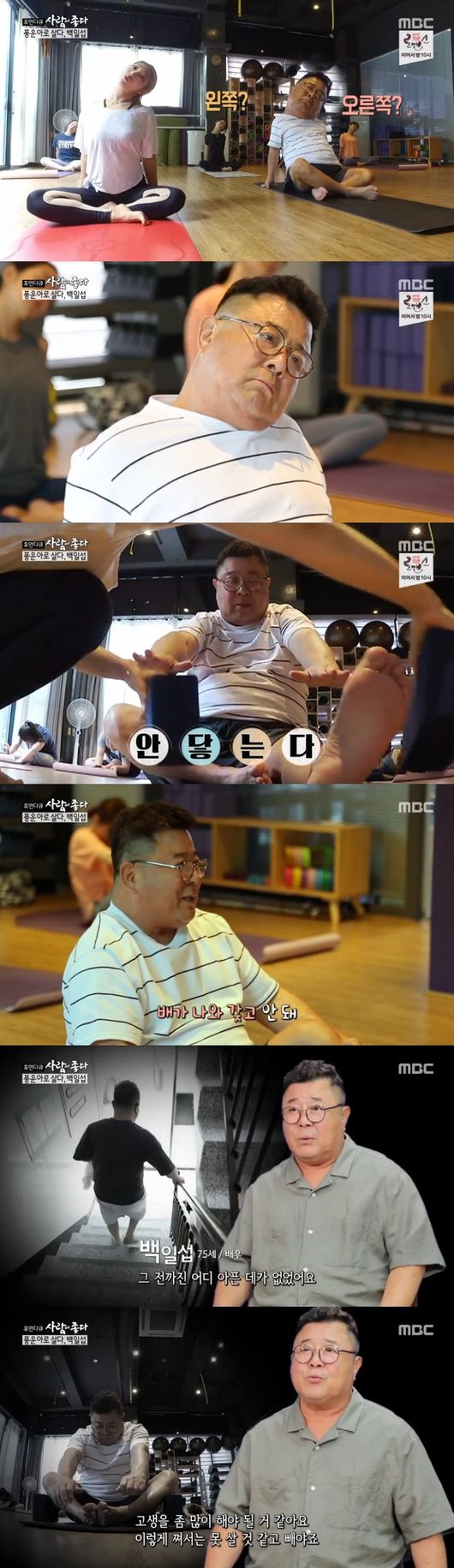 백일섭은 운동센터로 향했다. 3년 전 허리 수술 후 올해까지 이어진 무릎 수술에 최근 8kg가량 살이 쪘다고 했다. 이에 다이어트에 돌입했다고. 고민 끝에 백일섭이 선택한 운동은 다름 아닌 요가였다. 호기롭게 도전했으나 마음처럼 쉽게 따라주지 않는 몸이었다. 중간중간 깜빡 졸기도 하는 등 귀여운 모습도 보였다.