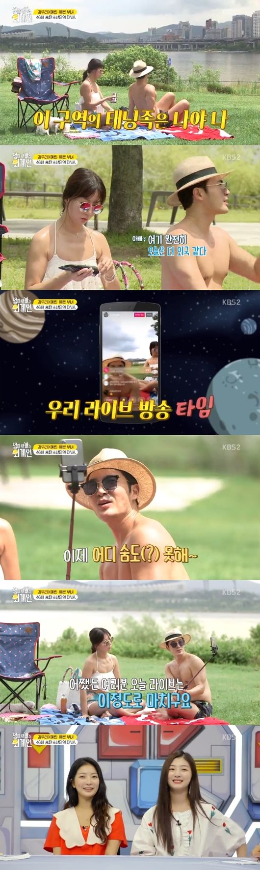 이후 김우리와 아내를 뚝섬유원지로 이동해 태닝을 하면서 '천생연분'의 모습을 보여줬다. 김우리는 "저기 텐트에 있는 사람들이 이상한 눈으로 본다. 근데 10년째 이렇게 쳐다본다"며 크게 개의치 않는다. 김우리는 어김없이 폰을 꺼내 SNS 라이브 방송을 했다.