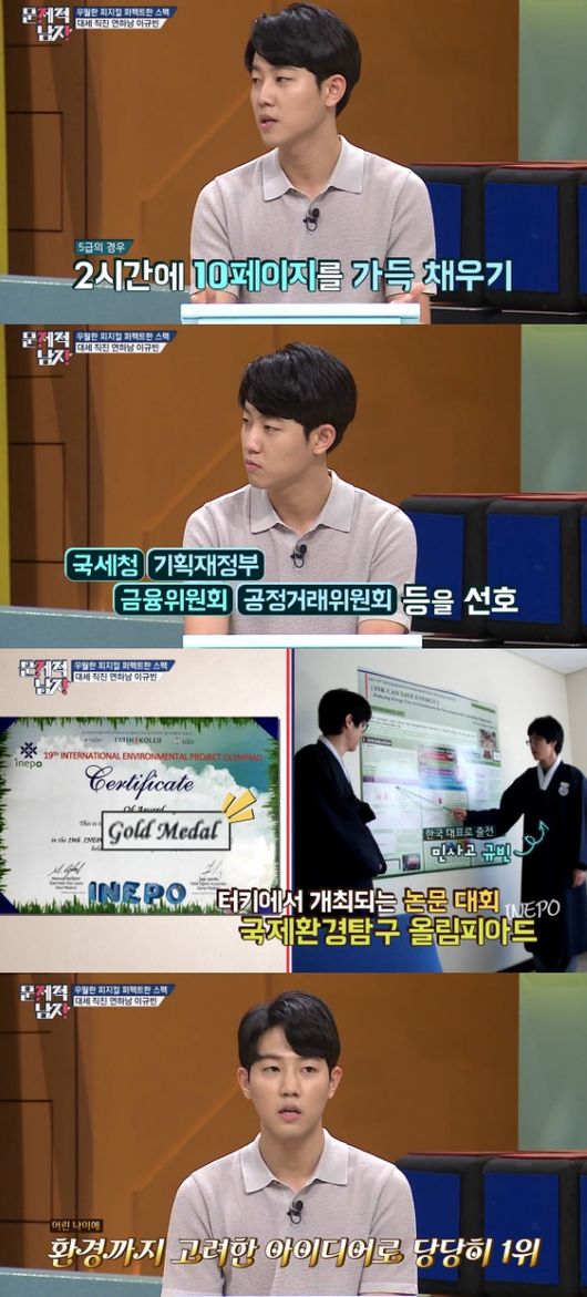 그는 학창 시절 전국 수학&과학 올림피아드를 휩쓸고, 환경까지 고려한 건물 에너지 절약 방법으로 국제 환경 올림피아드에서도 우승을 차지했다. 또 발명에 관심이 많아서 개별 탐구 활동 당시 발명반에서 아이디어 주고 받는 수업을 받았다는 이규빈은 특허 출원까지 한 발명품도 있다고 밝혀 모두를 놀라게 했다.