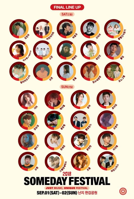 내달 1~2일 양일간 서울 난지한강공원에서 펼쳐질 ‘썸데이 페스티벌 2018’은 라인업을 차례로 공개하며 기대를 높이고 있다. 지금까지 김연우, 거미, 어반자카파, 케이윌, 크러쉬, 윤하, 양요섭, 용준형 등을 비롯한 대한민국의 내로라하는 실력파 아티스트들을 공개한 데에 이어 지난 23일, 최종 라인업까지 발표하며 31팀의 환상적인 라인업을 완성했다.