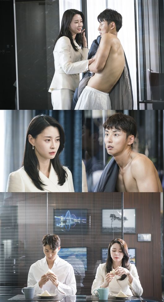 또 다른 사진에서는 어떤 이유에서인지 대화조차 없이 나란히 앉아 샌드위치를 먹는 두 사람의 모습을 확인할 수 있다. 바로 전까지 한강호에게 한없이 가깝게 다가섰던 주은의 모습과는 180도 다른 느낌이라 더욱 궁금증을 유발한다.