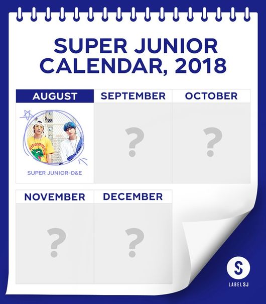 슈퍼주니어는 3일 오전 10시 공식 SNS를 통해 ‘SUPER JUNIOR CALENDAR, 2018’을 기습 공개했다. 업로드 된 달력의 8월에는 오는 16일 컴백을 예고한 슈퍼주니어-D&E의 이미지가 담겼으며, 9월부터 12월까지는 별도의 정보 없이 물음표만 표시돼 궁금증을 증폭시켰다.