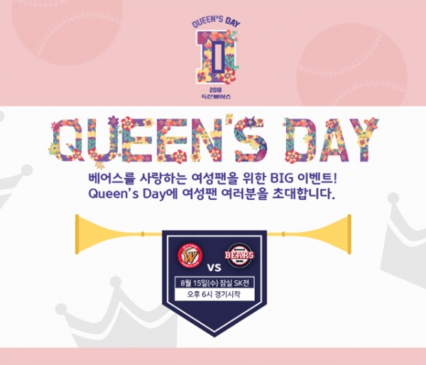 두산 베어스가 15일 잠실구장에서 열리는 넥센과의 홈경기에서 '퀸스 데이(Queen’s Day)' 이벤트를 펼친다.