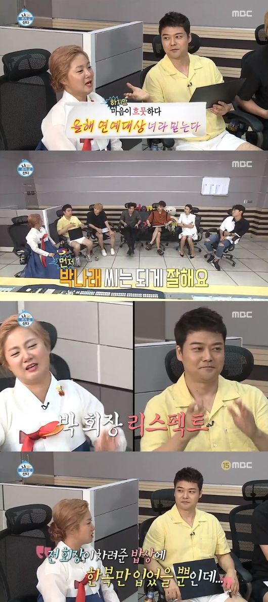 이에 박나래는 "사실 전 회장님이 많이 이끌어주시고 제가 원래 하던 포지션대로 한복만 입은 것 뿐이다"라고 소감을 밝혔다. 그러자 회원들은 "대상 수상 소감이냐"고 지적을 하기도. 박나래는 "주시면 감사하다"라고 말하며 흐뭇한 미소를 지었다.