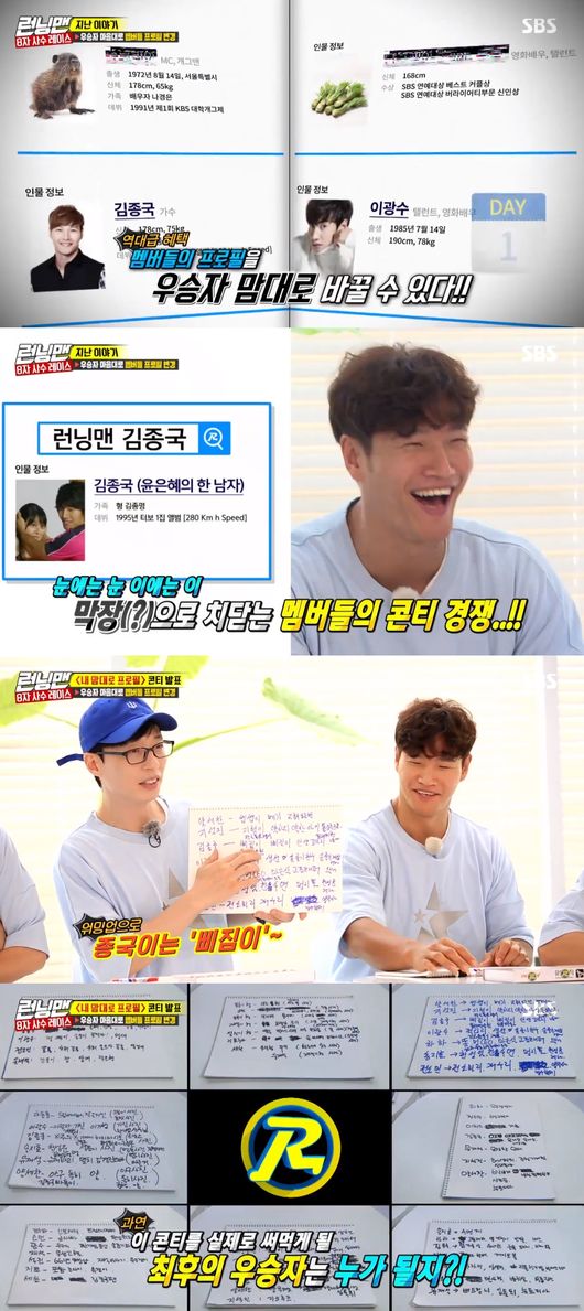 오늘 방송된 ‘런닝맨’에서는 멤버들의 프로필 변경권을 두고 치열한 레이스가 펼쳐졌다. 이에 김종국이 최종 우승했고 그 결과가 제일 먼저 ‘런닝맨’ 공식 홈페이지를 통해 소개됐다.