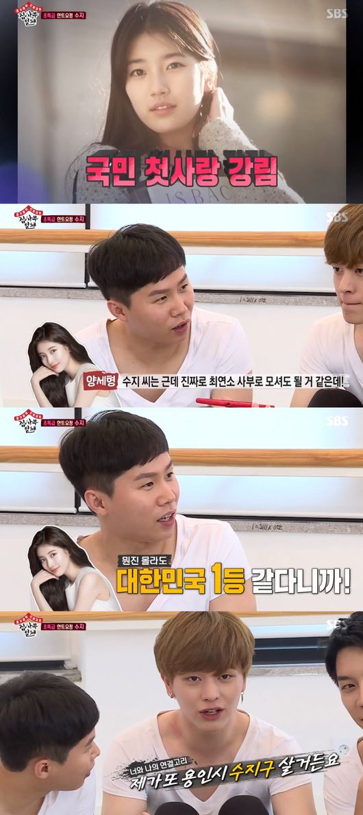 힌트 요정 수지의 등장에 이승기, 이상윤, 육성재, 양세형 등 '집사부일체' 멤버들은 흥분을 감추지 못했다. 양세형은 "수지 씨는 최연소 사부로 모셔도 될 것 같다"며 "대한민국 1등 같다. 멘탈 관리나 이런 부분에 있어서 정말 뵙고 싶다"고 수지를 사부로 모시고 싶다고 말했고, 육성재는 "전 용인시 수지구에 산다"고 수지와 억지로 연결고리를 만들려는 모습으로 폭소를 자아냈다.