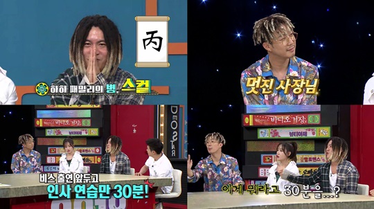 이날 스컬은 ‘비디오스타’ 녹화 전 사장 하하에게 불려가 인사연습만 30분을 받았다며 폭로했다. MC들은 “대체 어떤 인사기에 30분 동안이나 연습을 하냐?”며 궁금증을 표했다. 이에 스컬은 여러 버전의 “안녕하세요! 비디오 스타! 스컬 앤 하하입니다!”를 선보이며 스튜디오를 웃음바다로 만들었다. 이에 하하는 인사 연습의 이유를 “스컬이 예전 생방송 때 말실수를 한 적이 있다.”고 발혔고, 그 당시 스컬의 모습을 재연하며 받아쳤다.