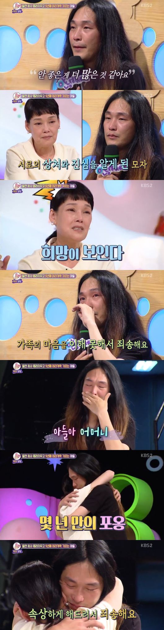 신동엽은 예전과 다르게 서로를 대하는 모습이 변한게 문제라면서 자식으로서 아들이 먼저 다가가면 안 될지 물었다. 아들은 단발머리 정도로 자르겠다고 큰 결심을 했다. 母역시 "본인 의사에 맡기겠다, 사랑한다 아들"이라며 눈물을 흘렸다. 아들은 "저도 가족을 이해 못해 죄송하다"면서 "한 번 크게 아프셔서 걱정했다, 오래 건강하시길 바란다"고 했다. 이영자는 포옹을 제안했고, 몇년 만에 두 모자가 포옹했다. 서로를 이해하며 다정한 모자로 돌아가길, 예전처럼 행복한 추억만 만드길 모두가 응원했다.