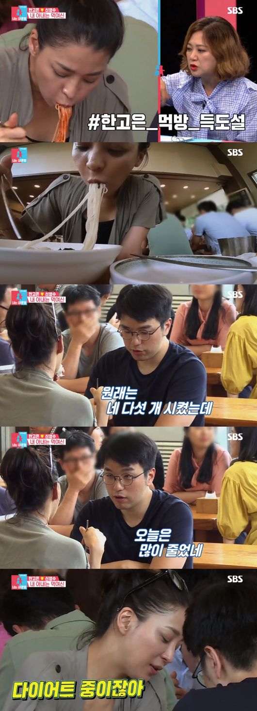한고은은 “우리 직종이 아무래도 체중과의 싸움이 치열한 곳이라서 대충 식사를 때우는 게 싫다. 한 끼를 먹어도 먹을 수 있을 때는 맛있는 걸 먹고 싶다”면서 비빔국수를 입 안에 가득 채워 먹었다. 남편과 대화하면서도 한고은의 비빔국수 먹방은 계속 이어졌다.