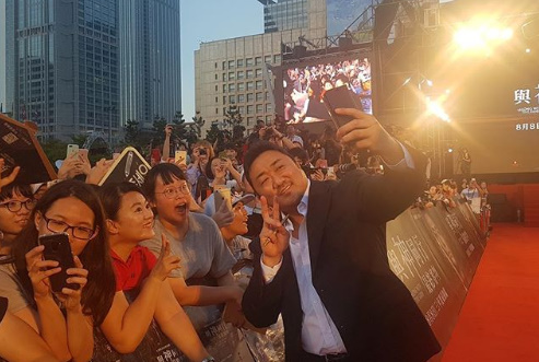 공개된 사진 속 마동석은 레드카펫에서 대만 팬들에게 스마트폰으로 사진을 찍어주고 있다. 엄청나게 몰린 인파로 마동석의 인기를 실감할 수 있다.