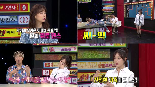 하하는 가장이 된 이후 아버지의 마음을 이해하게 되었다며 가장의 무게에 대한 심경을 토로했다. 이에 별은 요즘 부쩍 지쳐 보이는 하하를 위로하는 자신만의 특급무기가 있다며 애교댄스를 공개했다.
