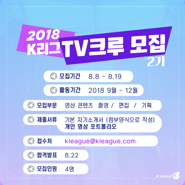 9월부터 12월까지 적극적 활동이 가능하고, K리그에 대한 열정이 넘치는 지원자라면 누구나 도전할 수 있다. 모집분야별로 우수한 콘텐츠 제작 능력을 갖추었거나 기존 개인 영상 채널을 운영하고 있는 지원자는 우대한다.