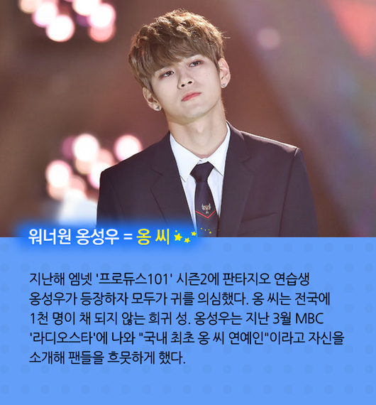 지난해 엠넷 '프로듀스101' 시즌2에 판타지오 연습생 옹성우가 등장하자 모두가 귀를 의심했다. 옹 씨는 전국에 1천 명이 채 되지 않는 희귀 성. 옹성우는 지난 3월 MBC '라디오스타'에 나와 "국내 최초 옹 씨 연예인"이라고 자신을 소개해 팬들을 흐뭇하게 했다.