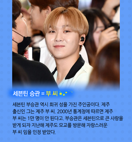 세븐틴 부승관 역시 희귀 성을 가진 주인공이다. 제주 출신인 그는 제주 부 씨. 2000년 통계청에 따르면 제주 부 씨는 1만 명이 안 된다고. 부승관은 세븐틴으로 큰 사랑을 받게 되자 지난해 제주도 모교를 방문해 자랑스러운 부 씨 임을 인정 받았다.