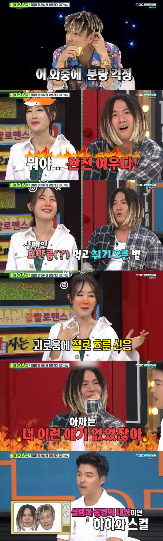 하하는 스컬에 대해 "원래 웃긴 사람, 카메라 앞에선 얼음이 된다"면서 예전 생방 말실수로 트라우마가 있다고. 스컬은 당시를 회상하면서 "원래 여자 박나래로 불린다"고 말해 웃음을 안겼다.