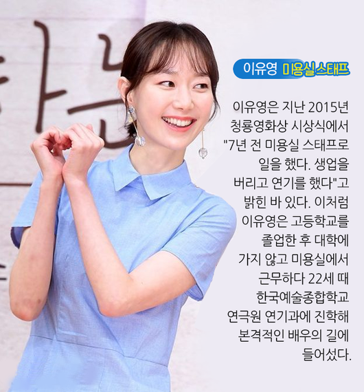 이유영은 지난 2015년 청룡영화상 시상식에서 "7년 전 미용실 스태프로 일을 했다. 생업을 버리고 연기를 했다"고 밝힌 바 있다. 이처럼 이유영은 고등학교를 졸업한 후 대학에 가지 않고 미용실에서 근무하다 22세 때 한국예술종합학교 연극원 연기과에 진학해 본격적인 배우의 길에 들어섰다. 현재는 김고은, 박소담과 함께 '한예종 10학번 트로이카'로 불리고 있으며 SBS 수목드라마 '친애하는판사님께'에 출연 중이다.