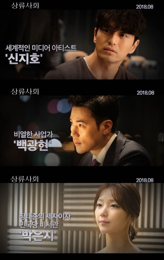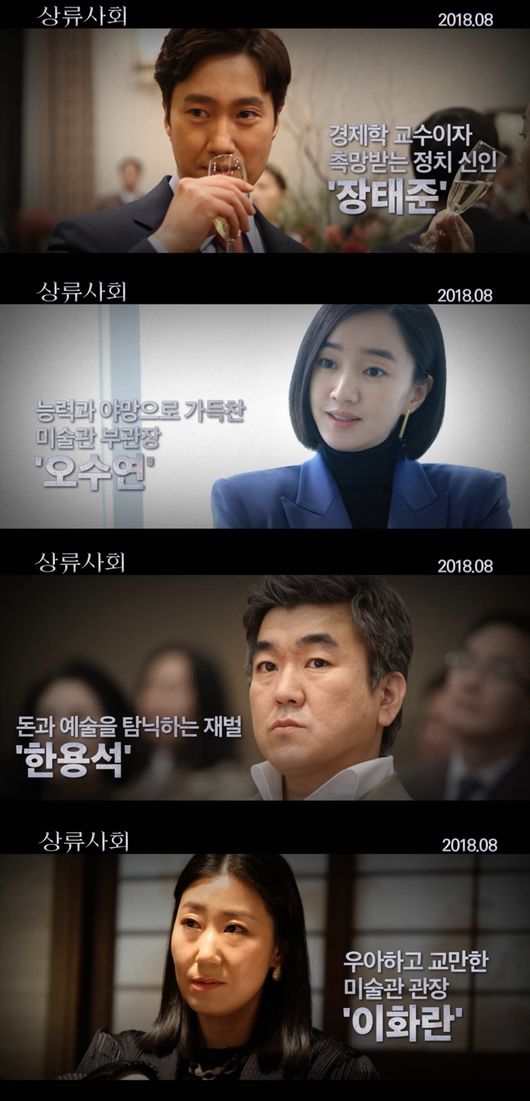 공개된 캐릭터 영상은 대한민국 최상류층을 원하는 인물들에 더해 이미 그 세계에 속한 다양한 캐릭터의 욕망과 미묘한 관계를 담아내 눈길을 끈다. 먼저 경제학 교수에서 촉망받는 정치 신인으로 거듭난 ‘장태준’은 사회문제에 열정적인 지식인의 모습으로 관심을 모은 가운데, 정치인으로 변신해 상류사회를 향한 스스럼없는 야심을 표출하며 궁금증을 자극한다. 이어 능력과 야망으로 가득찬 미술관 부관장 ‘오수연’은 상류사회로 올라가기 위해 수단을 가리지 않는 모습은 물론, 미술관 관장이 되려는 마음을 솔직하게 드러내 도발적인 매력으로 관객들의 시선을 강탈한다.