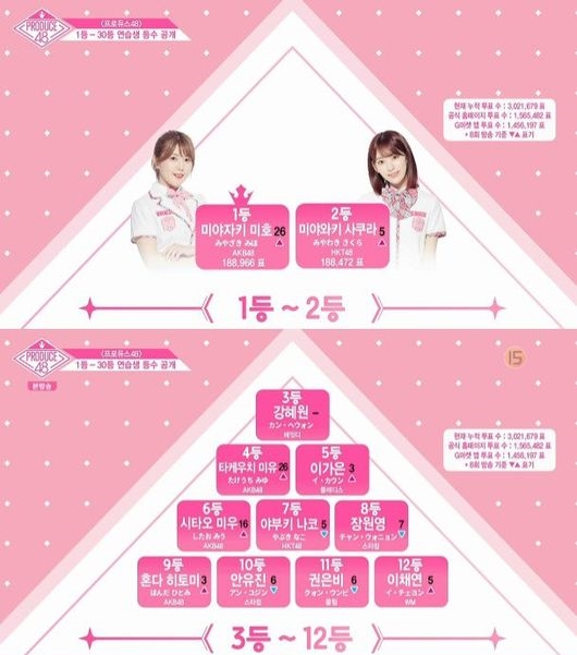 '프로듀스48' AKB48 미야자키 미호가 무려 26계단 상승한 수치로 새로운 1위에 이름을 올리며 또 한 번 순위 대격변을 만들어냈다.