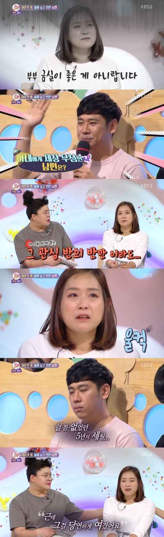 세상 무심한 남편이 등장했다. 그는 "무관심 인정한다, 말 안하는 것도 인정한다"고 했다. 아내는 "아이들에게 쏟는 관심 반의 반만 관심을 달라"면서 "5년동안 세명의 아이를 낳았다"며 울컥했다. 쉴 틈 없었던 5년의 세월 동안 계속되는 임신과 출산을 반복하며, 일을 쉰 적이 없다고 했다. 아내는 "그걸 당연하게 여겼다, 남들보다 뒷전같다"며 울컥했다.