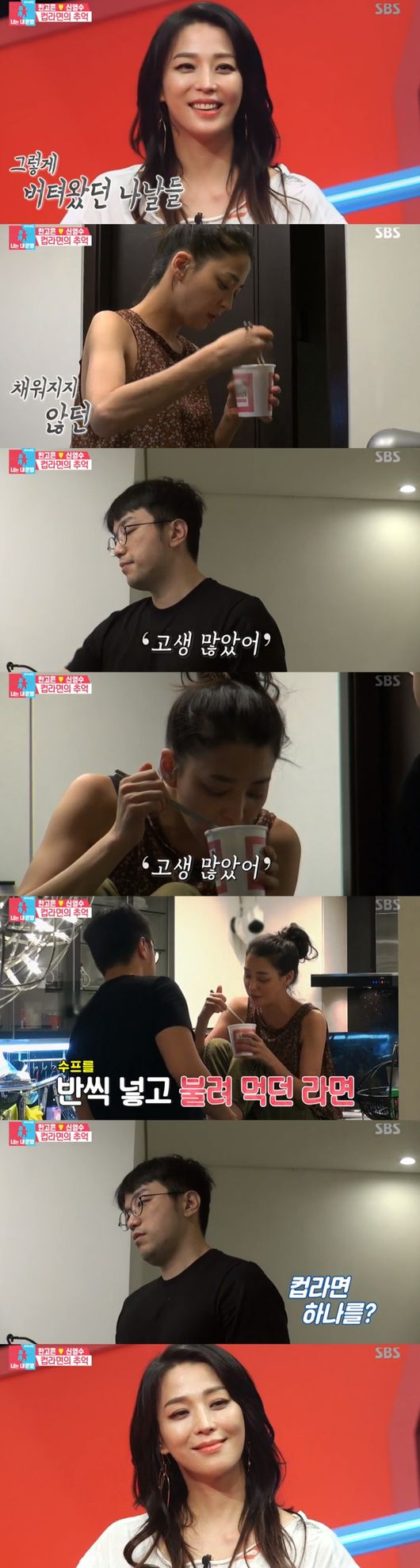 한고은은 "컵라면 보면 옛날 생각 나. 파란만장한 시절 때, 정말 돈이 없어서 이걸 먹었어"라고 말했다. 이어 "컵라면 하나에 스프를 반씩 넣어서 두 개로 나눠서 불려서 먹었다"며 "당시 타바스코가 공짜였다. 스프를 다 쓰면 싱거우니까 넣어서 먹었다"고 털어놨다.
