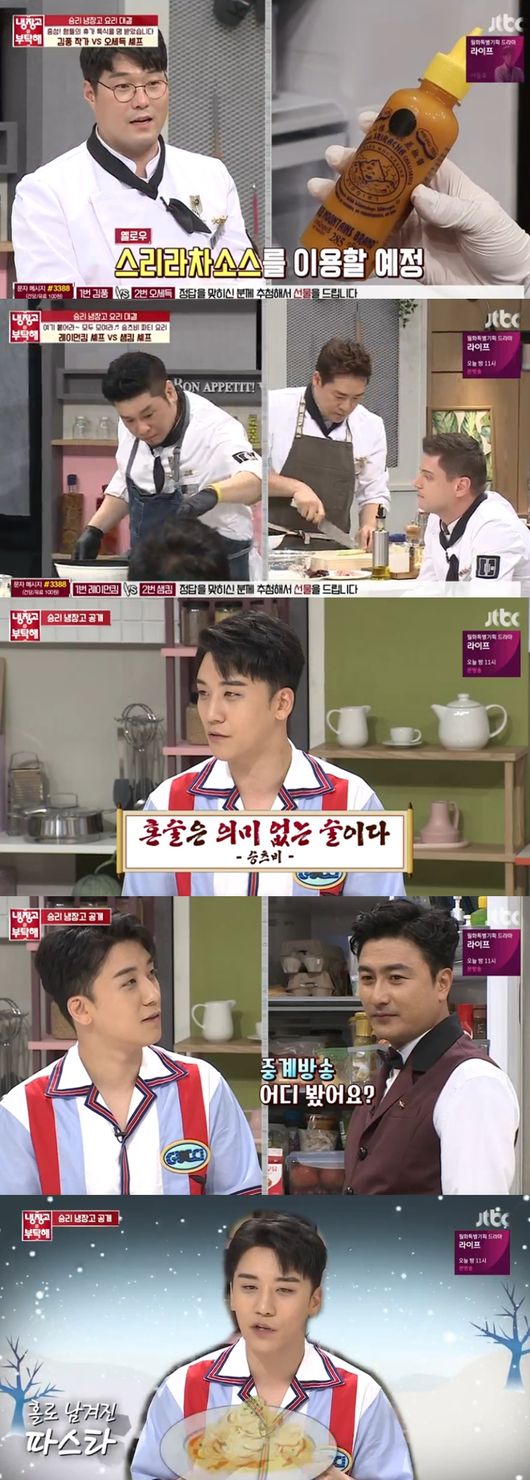 이날 승리는 자신의 뒷소문부터 빅뱅 멤버들까지 다양한 이야기를 들려주며 단숨에 보는 이들을 사로잡았다. MC 안정환, 김성주와 셰프들도 승리의 입담에 푹 빠져 연신 웃음을 터뜨렸다.
