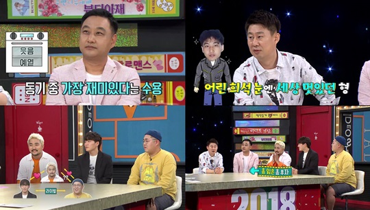 이날 남희석은 “우리 형이 유재석, 박수홍, 김용만보다 웃기다.”며 김수용에 대한 애정을 드러냈다. 개그맨 후배인 MC 김숙과 박나래 또한 “김수용은 사석에서 정말 웃긴 개그맨”이라며 공감했다. 또한 남희석은 옛날에는 김수용이 제일 잘생긴 것 같았다며 과거를 회상했다. 이에 김수용은 과거 “신인 시절, 피디들이 나에겐 반말을 쓰면서 남희석에겐 존댓말을 하더라.”라고 말하며 “나보다 남희석이 나이가 많은 줄 알았다더라.”라고 폭로했다. 이를 들은 MC와 출연진들은 충분히 이해가 간다며, 공감하는 모습을 보여 스튜디오가 웃음바다가 되었다는 후문.