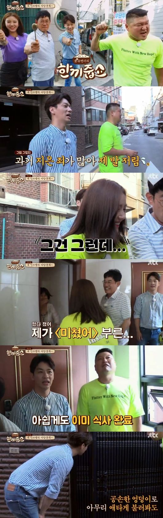 어김없이 자양동 한끼가 시작됐다. 정따오 정상훈부터 도전했다. 마침 현관문이 열려있는 집이었다. 선한 미소를 트레이드 마크로 한끼를 도전, 하지만 가정집을 개조한 회사였다.이번엔 담비가 도전했다. 담비는 "무섭다"며 첫 벨에 긴장했다. 벨소리를 듣고 문을 열어줬다. 하지만 얘기도 끝나기 무섭게 거절당했다.