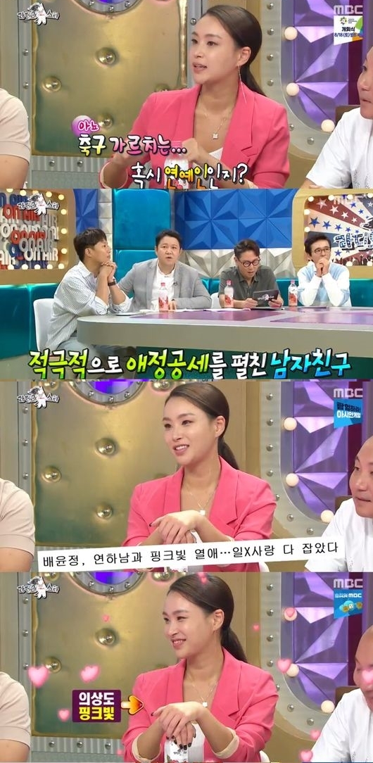 이날 배윤정은 열애와 독설 등 자신을 둘러싼 이야기에 대해 거침없이 이야기하며 솔직 담백한 매력을 뽐냈다. 좋아하는 사람 앞에서는 상냥해진다고 밝힌 배윤정은 남자친구에 대한 질문에 “축구를 가르치는 분”이라고 시원하게 고백했다. 지난해 가수 제롬과 이혼한 후 새로운 사랑을 찾은 것.