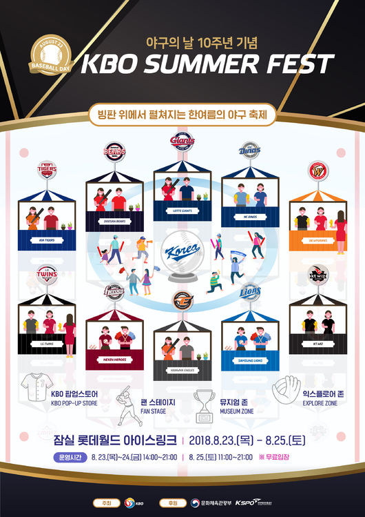 KBO(총재 정운찬)가 주최하고 문화체육관광부가 후원하는 야구의 날 10주년 기념 'KBO SUMMER FEST'가 오는 23일부터 3일간 잠실 롯데월드 아이스링크에서 개최된다.