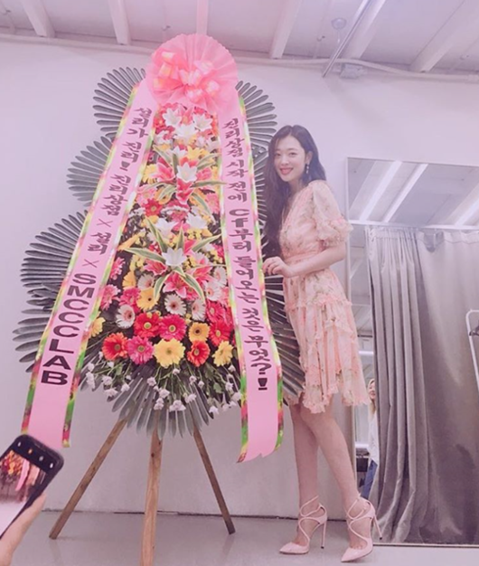 설리는 16일 오후 자신의 SNS에 “어떤 새로운 광고 촬영일까요? 더운데 응원하러와준 #진리상점 팀 오늘도 최고”라는 글과 함께 사진 한 장을 공개했다. 사진에는 설리가 자신의 광고 촬영을 응원하는 문구가 새겨진 화환 앞에서 환하게 웃고 있는 모습이 포착돼 있다.