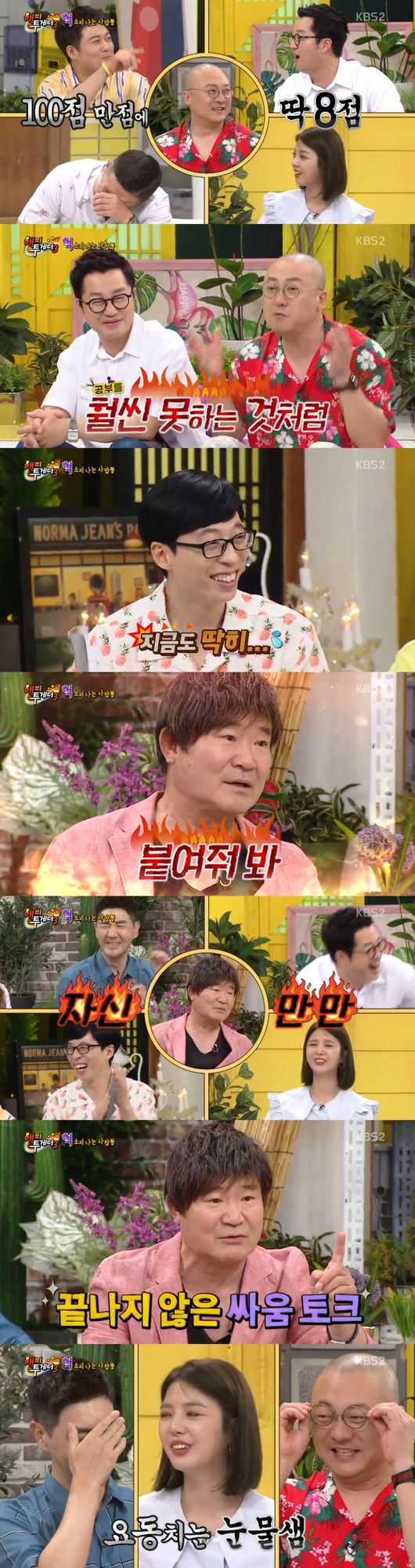 레전드 였던 염경환과의 학창시절 토크를 시작했다. 수학시간 모르는 것을 물어봐도 대답없이 책만 뚫어져라 쳐다봤다고. 풀버전 영어사전도 중요단어를 통암기했으나 영어시험은 정작 8점을 받았다고 했다. 그럼에도 불구하고 공부에 올인했다고. 염경환이 보름에 한번씩 쓰러졌다고 했다. 새벽 5시반에 등교해 보름마다 과로로 쓰러졌다고. 공부를 열심히 했냐는 말에 염경환은 "열심히 한 거에 비해, 안 나온 걸 개그로 극대화시켰다"면서 "그래도 얘보다 공부를 훨씬 못하지 않았다"며 세상 억울한 모습을 보였다.