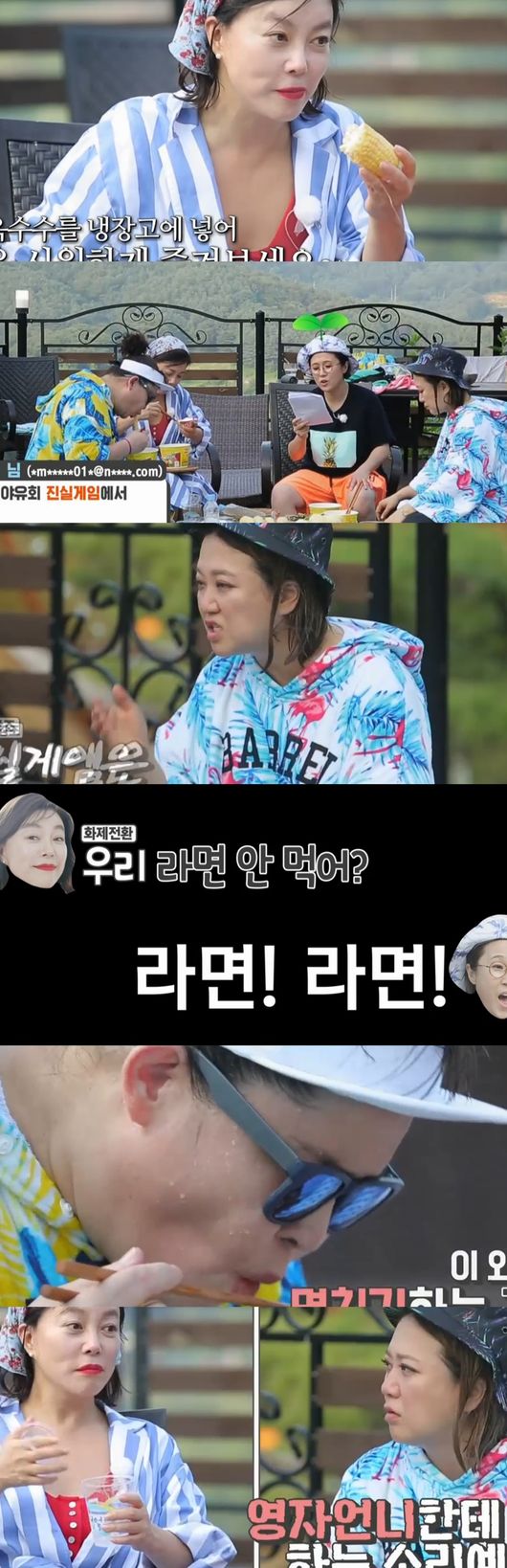 이들은 수영장에서 한바탕 시원한 물놀이를 즐긴 뒤, 감자와 옥수수로 간식을 먹기 시작했다. 컵라면까지 폭풍 흡입을 했다. 최화정은 "물놀이에서 라면은 최고다"고 말했다. 김숙도 "물놀이 후 라면은 딱 수순이다"고 말했다.