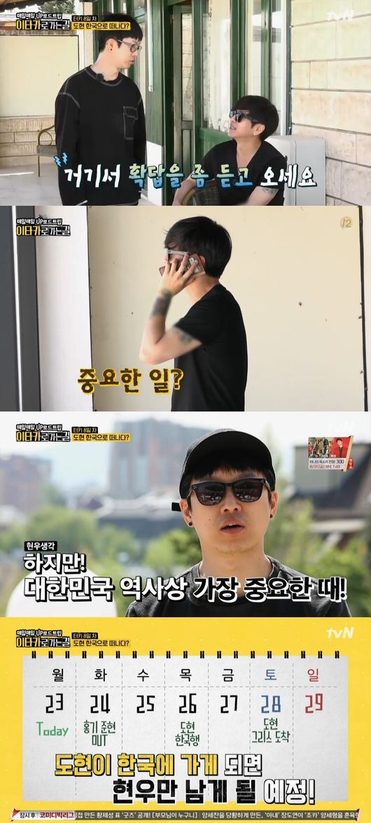 지난 19일 오후 방송된 tvN '이타카로 가는 길'에서는 윤도현이 남북정상회담 만찬을 위해서 터키에서 한국으로 떠나야하는 모습이 그려졌다.