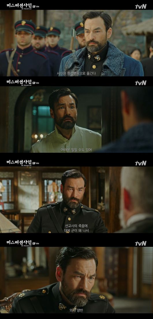 지난 19일 방송된 tvN ‘미스터 션샤인’ 14화에서는 카일(데이비드 맥기니스)이 선교사 요셉의 죽음에 힘들어하는 유진(이병헌 분)을 도와주는 장면이 그려졌다.