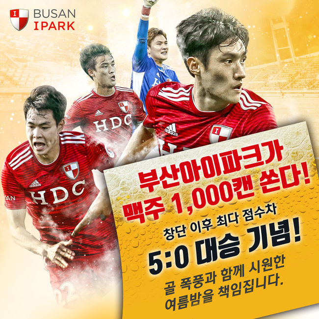 K리그2 부산아이파크가 창단 이 후 K리그 최다 점수차를 기념해 맥주 천 캔을 쏜다.